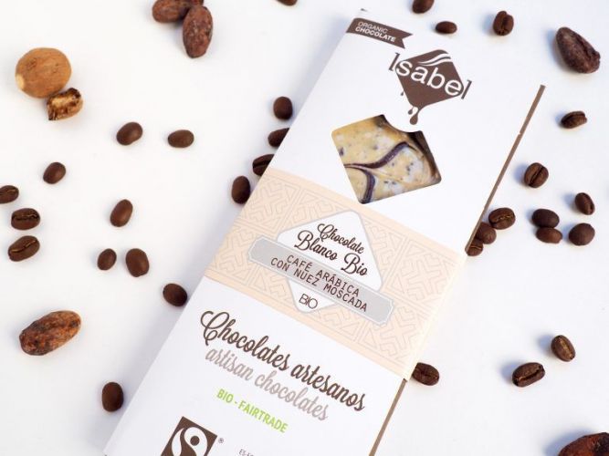 Tableta BIO y Comercio Justo de chocolate blanco con café arábica de Nicaragua y nuez moscada. SIN GLUTEN.